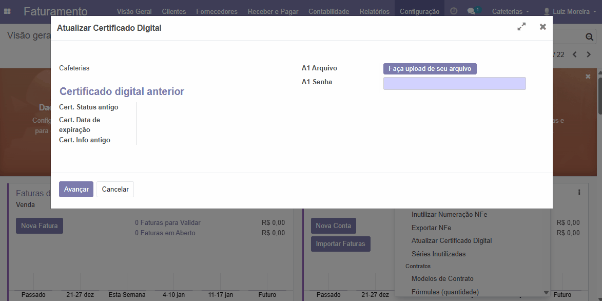 Dentro do módulo de Faturamento, vá até o menu superior, clique em Configurações e selecione a opção "Atualizar Certificado Digital".